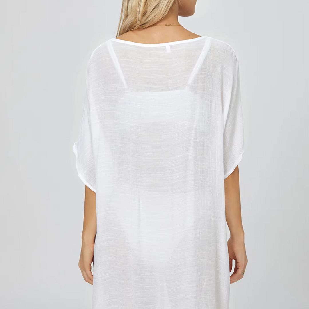 Ce cache maillot de bain est fabriqué en polyester léger, ce qui lui confère une capacité unique à sécher rapidement tout en permettant à votre peau de respirer. La texture douce et lisse du tissu garantit un confort sans irritation, même lors des journées les plus chaudes. Sa couleur blanche éclatante reflète les rayons du soleil, minimisant la chaleur tout en ajoutant une touche d'élégance à votre look plage.