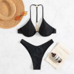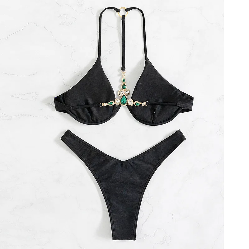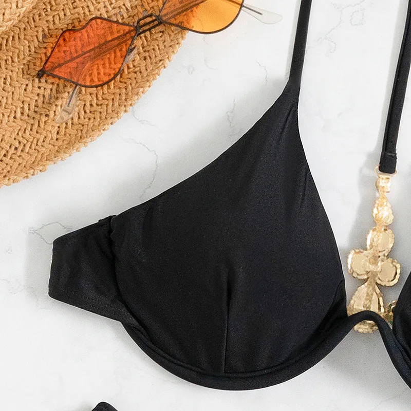 Ce maillot de bain brésilien deux pièces noir avec son bijou fantaisie au dos est lui même un petit bijou du genre. Son bas est échancré à souhait et le soutien-gorge n'est pas en reste : avec son design à armature unique, ses lanières fines qui montent pour former le dos nu, et finalement une seule qui redescend chercher le bijou, il est également minimaliste.