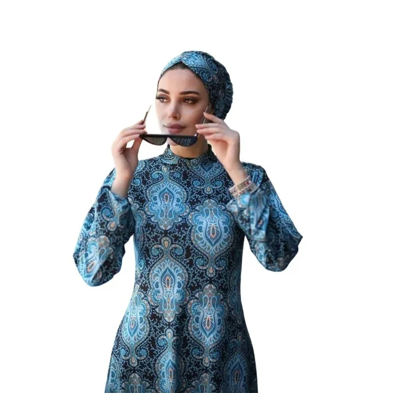 Le maillot de bain burkini bleu avec motifs traditionnels n'est pas seulement un vêtement de bain; c'est une pièce d'art. Les motifs délicats reflètent l'héritage culturel et artisanal, faisant de chaque burkini une œuvre unique. Portez ce maillot pour afficher non seulement votre goût pour la mode, mais aussi votre appréciation pour les designs qui racontent une histoire.