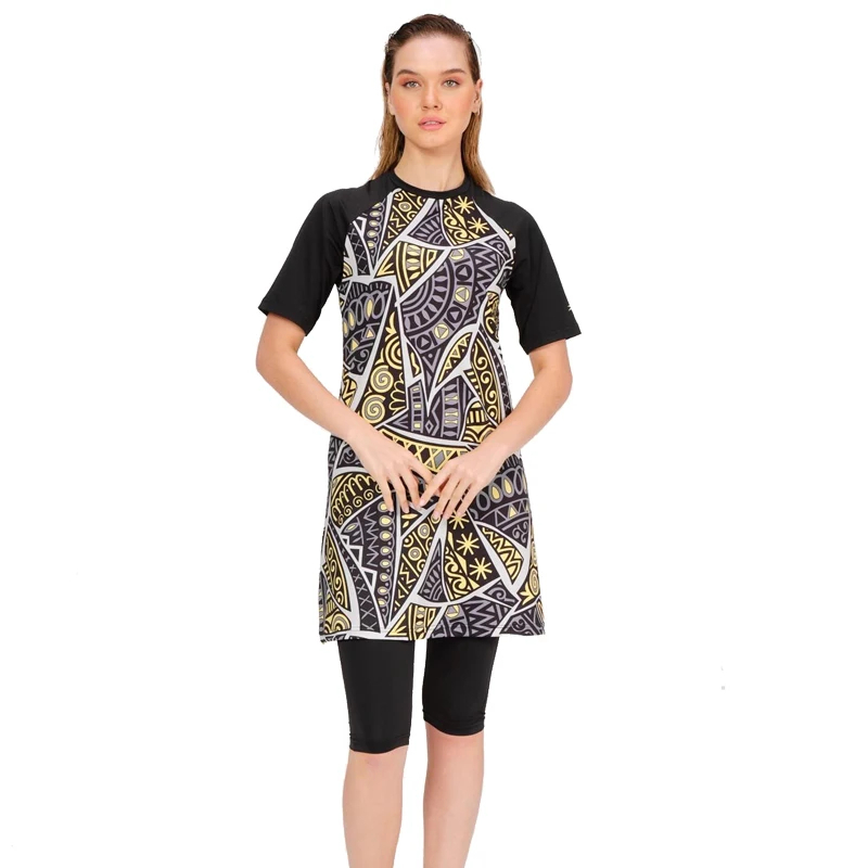 Le maillot de bain burkini à motifs géométriques est le choix idéal pour celles qui souhaitent allier mode et modestie. Les motifs géométriques jaunes et gris ajoutent une dimension artistique et dynamique au design, reflétant une personnalité audacieuse et créative. Ce burkini ne se contente pas de suivre les tendances, il les définit, permettant à chaque femme de se sentir belle et confiante en valorisant son style personnel tout en respectant ses besoins de confort et de couverture.