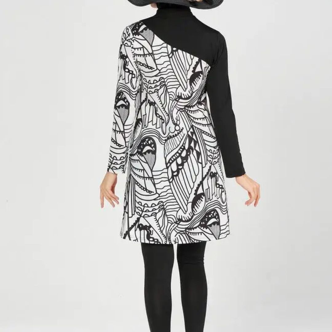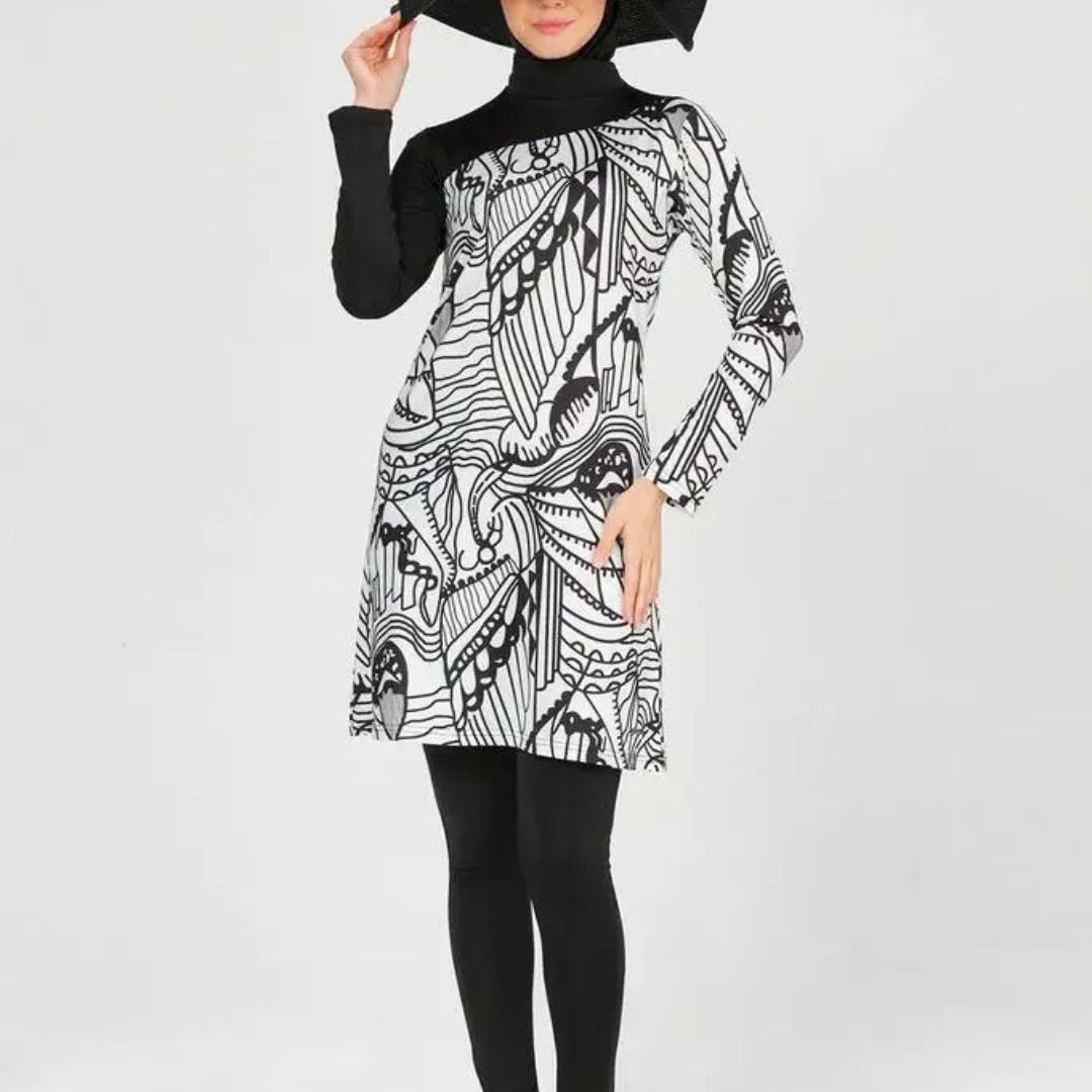Le maillot de bain burkini style moderne et abstrait brille par son esthétique unique. Les motifs abstraits et la palette de noir et blanc offrent un look contemporain qui attire le regard, parfait pour celles qui aiment se démarquer. Ce design avant-gardiste n'est pas seulement beau à regarder, il est également conçu pour inspirer confiance et élégance chez celle qui le porte.