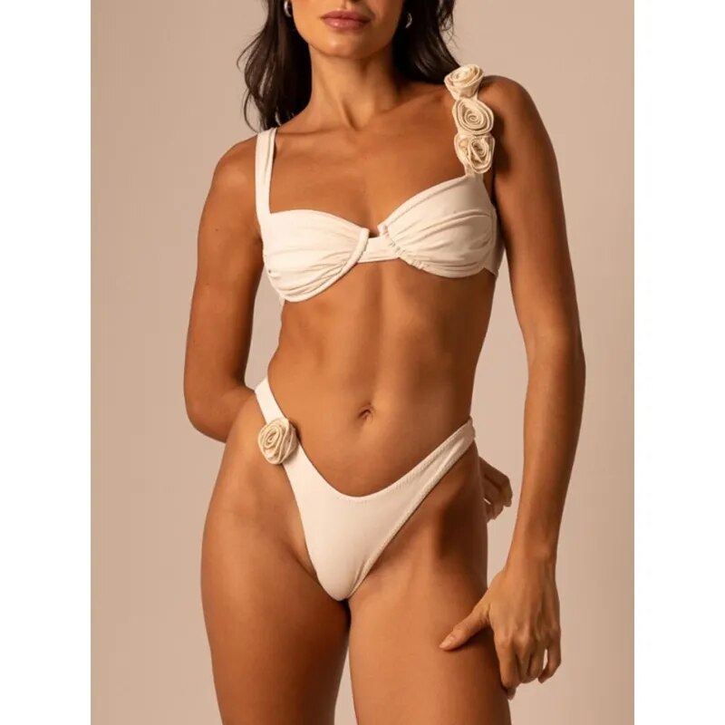 Ce maillot de bain femme string deux pièces avec roses en tissu est fait pour sublimer le corps de la femme. Le string à bande large remonte et allonge la jambe, s'ajuste à la cambrure des reins et descend légèrement en v sur le devant pour affiner la taille. Le soutien gorge et son côté sage englobe bien la poitrine avec son tissu élastique et vous apporte le confort.