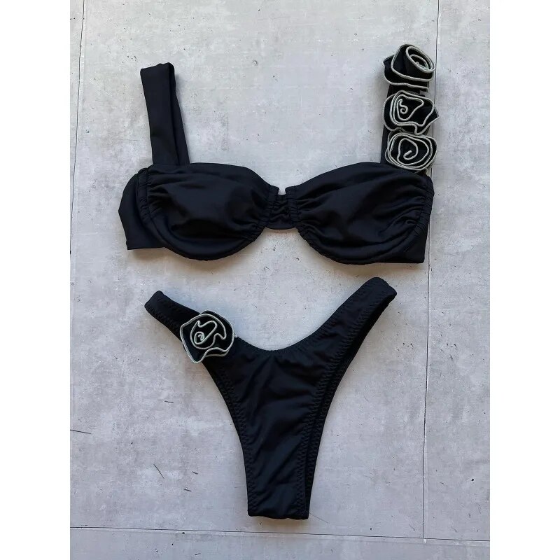 Ce maillot de bain deux pièces string est conçu avec des matières de qualité et son design mêle le glamour au style brésilien : le soutien gorge à armatures vous fera une poitrine magnifique rehaussée de trois roses sur la bretelle gauche qui apporte du romantisme. Le bas de forme string brésilien remonte haut sur les hanches pour allonger vos jambes et le rappel d'une rose l' assagit.