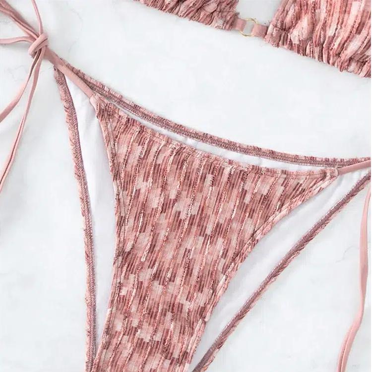 Ce maillot de bain ficelle deux pièces bikini style tricot a été conçu dans des matières de qualité qui vous garantissent la longévité et la tenue du maillot. Les finitions sont également soignées et étudiées pour vous apporter un maximum de confort comme la doublure intégrale douce et à séchage rapide. Il est conseillé de le laver à la main pour éviter de le déformer.