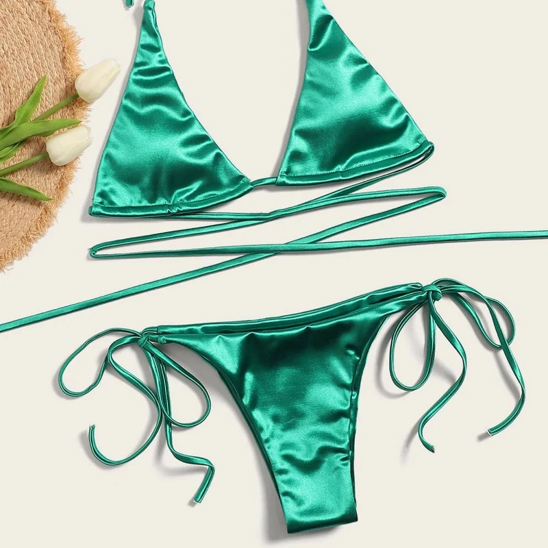 La texture soyeuse de ce maillot de bain tissu satiné caresse délicatement le corps. Quant à la coupe tanga, elle met en valeur les courbes féminines de manière subtile et sexy. Les côtés échancrés soulignent les hanches, tandis que l'arrière dévoile légèrement les fesses pour un effet séduisant. Cette coupe flatteuse permet de se sentir à la fois sensuelle et confiante lors des journées ensoleillées à la plage ou au bord de la piscine.
