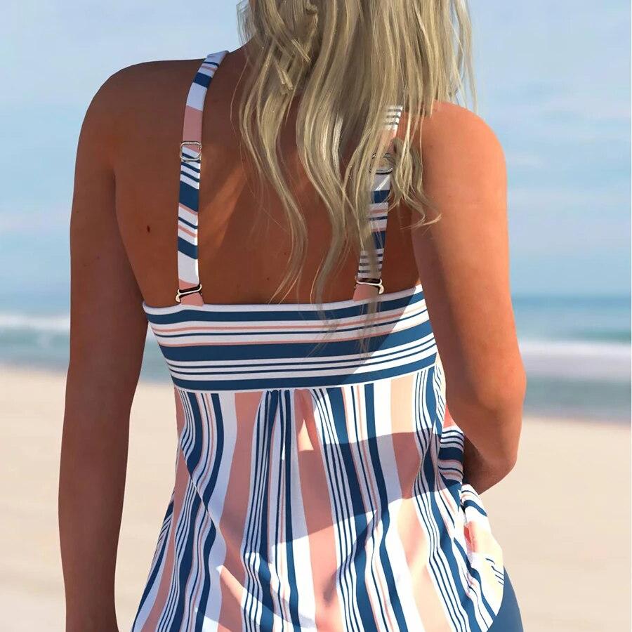Fabriqué à partir d'un mélange de tissus de qualité, ce maillot de bain tankini à rayures offre une sensation de douceur et de légèreté sur la peau, vous permettant de vous sentir à l'aise tout au long de la journée. Sa coupe tankini, avec un haut couvrant le ventre et un bas de bikini assorti, offre une silhouette flatteuse et met en valeur vos courbes naturelles.