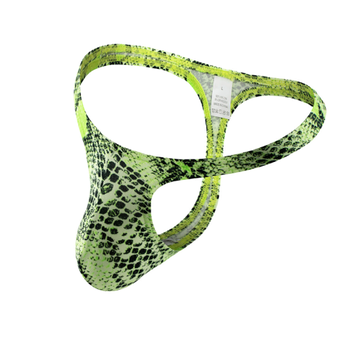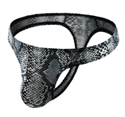 Ce maillot de bain string a la particularité d'être fabriqué dans un tissu pour le moins inhabituel mais parfaitement adapté, un imprimé effet serpent. Il ajoute une connotation sexy à ce string déjà très évocateur. Son design en T, un peu comme les tanga, lui permet de cacher le minimum et de mettre en valeur les attributs masculins, devant comme au dos, de manière spectaculaire.