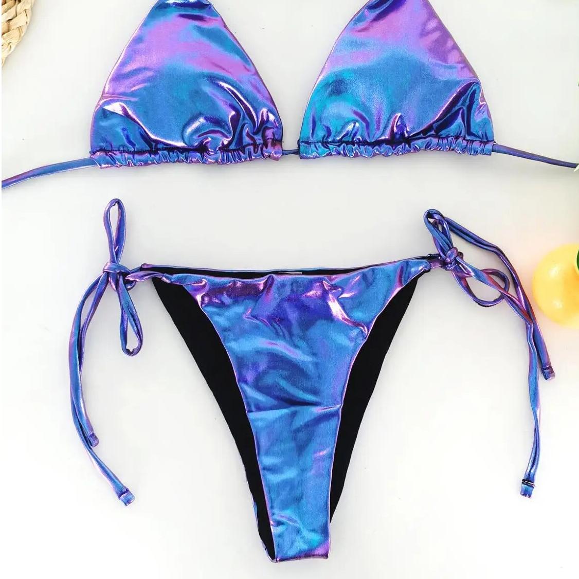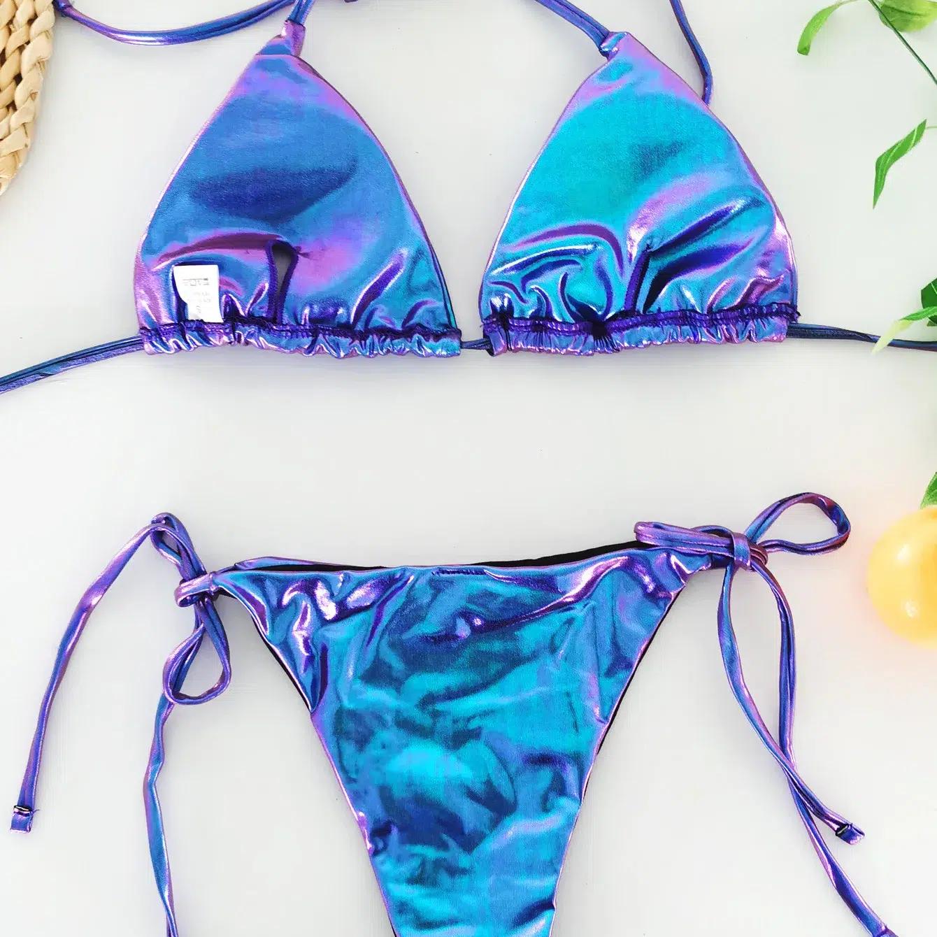 Ce maillot de bain irisé deux pièces modèle 2 se différencie du premier par sa coupe en triangles : le soutien gorge tout d'abord, en forme de triangles, sur un lien coulissant qui vous permet de l'ajuster à votre poitrine et dos nu noué sur la nuque, puis la culotte échancrée qui rappelle le triangle du haut et se ferme en nouant les liens sur les côtés à votre convenance.
