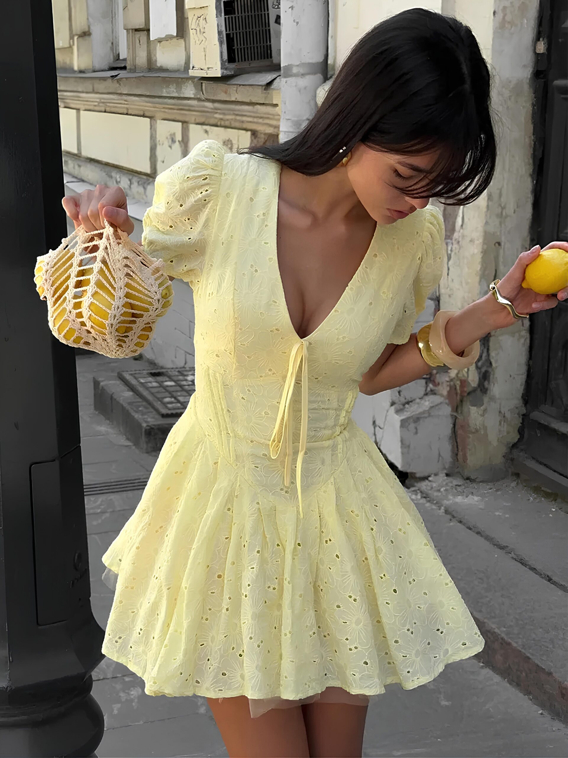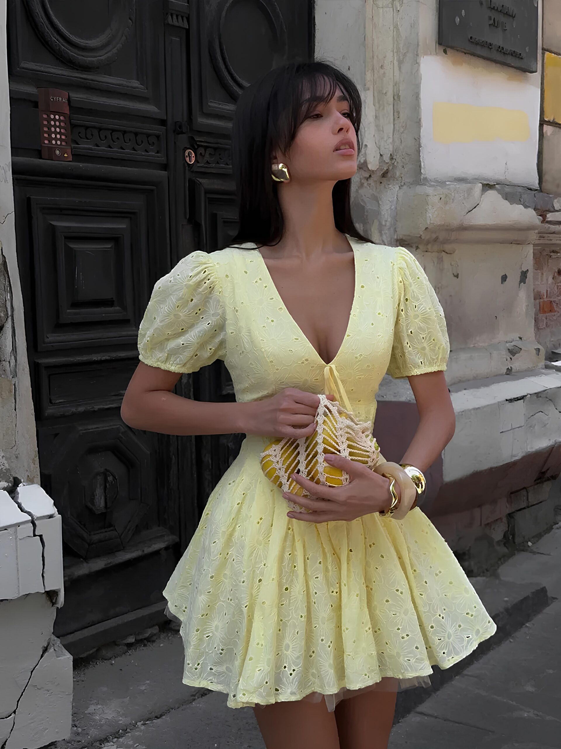Illuminez vos journées avec cette sublime robe en broderie anglaise jaune pâle. Son tissu ajouré délicat laisse transparaître la peau avec élégance tandis que les manches bouffantes courtes apportent une touche romantique. Le décolleté en V plongeant et la jupe patineuse créent une silhouette féminine et séduisante. Parfaite pour vos soirées d’été, cocktails ou escapades ensoleillées, cette robe attire tous les regards.